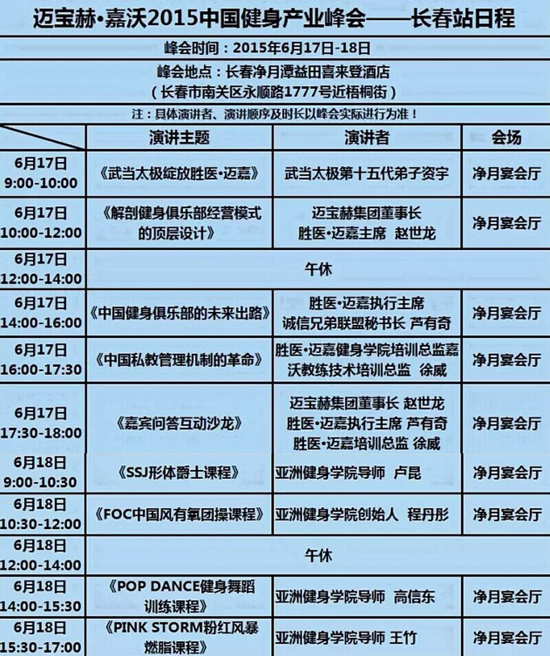 2015“健身的革命”中国健身产业峰会全国巡讲相继在四月的南京、五月的福州圆满举办后,下一站将在6月17至18日走进北国春城-吉林长春,与东北地区健身俱乐部投资人共同探讨创新经营理念,再次发起健身的革命,寻找中国合伙人,揭开暴利模式的答案。